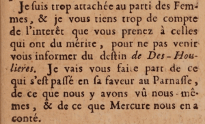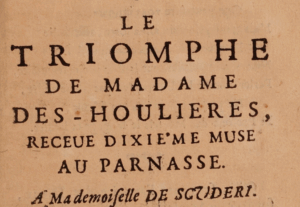 Faut-il dire « Deshoulières » ou « Madame Deshoulières », comme le porte le titre de l’édition au programme ? Marie-Jeanne Lhéritier, qui a consacré à notre poétesse un panégyrique intitulé Triomphe de Madame Des-Houlières (1694), la nomme presque systématiquement « Des-Houlières » dans le cours de son texte. Dans un éloge aussi stratégique que le Triomphe, destiné à répondre à Boileau et à faire entrer à titre posthume la poétesse dans une Académie féminine imaginaire, pour la simple raison que les portes de l’Académie française étaient fermées aux femmes, le choix de l’écrivaine est hautement significatif : priver Antoinette Deshoulières de sa civilité revient à la traiter comme on eût fait d’un écrivain masculin, et à revendiquer pour elle les mêmes prérogatives que celles dont jouissent les hommes.